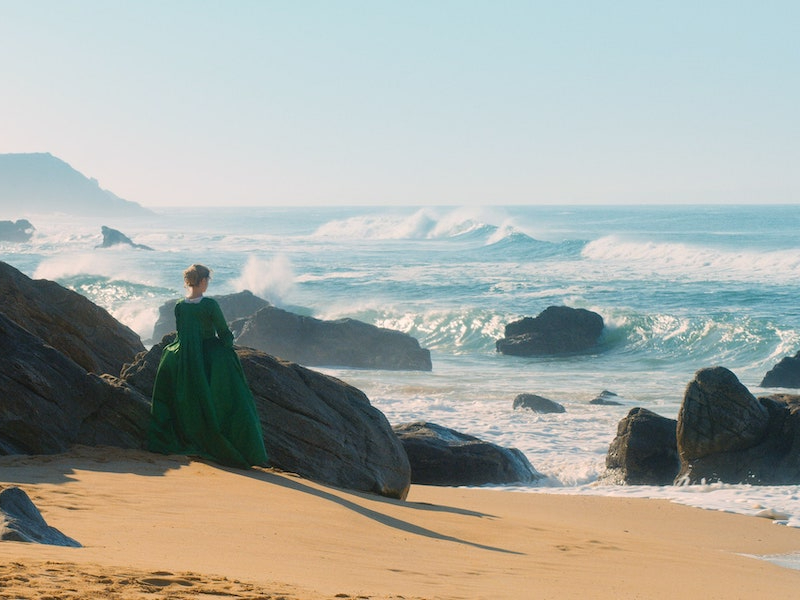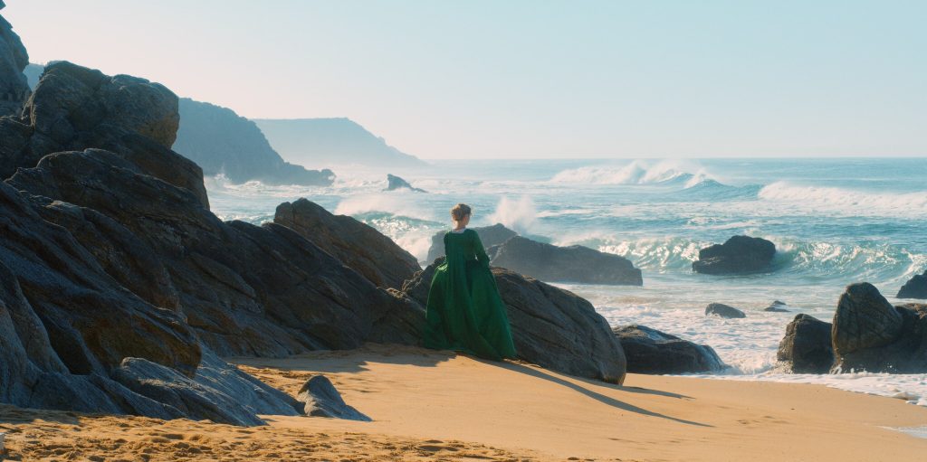 Portrait of a Lady on Fire is Sciamma’s description of love; the attraction, the affection, the flourishing of a relationship, and then the letting go. Sciamma tells a story of two women in love, looking at each other. Sometimes their gaze meets between the seat of the model and the painter’s easel, or over the piano when Marianne plays Vivaldi’s Storm for Héloïse. Attending a bonfire one night, with a sorority of women chanting around them, they stare at each other over the fire so intently that Héloïse’s skirt catches fire unbeknownst to her, her gaze fixated on Marianne. Sometimes Marianne looks at Héloïse from behind a scarf that covers her face, and sometimes the viewer sees only her likeness within coats of paint. In heartbreaking moments Héloïse appears as an apparition in a white dress. And a few special times she appears from behind just like the Wanderer, the camera eye following her as a companion to Marianne. A scene towards the end shows Héloïse as a Rückenfigur, having run away from the house to the seashore in her emerald green outfit. Standing by massive rocks and pearly, breaking waves, looking ahead towards the sea, her back is turned to the camera. The wind sweeps her long, heavy dress and her fair hair. One can only imagine the expression on her face.