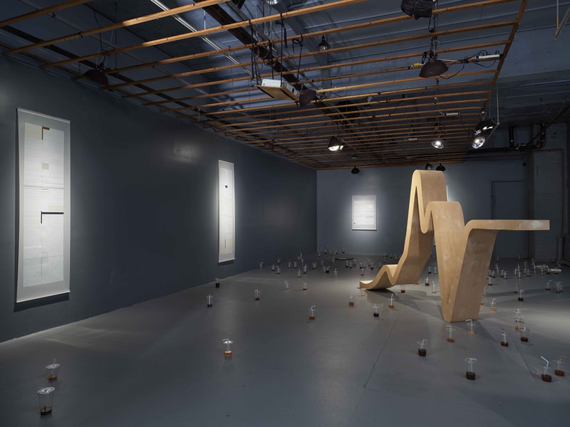 A large-scale, wooden sculpture stands in the spotlight between the dim gray walls of FiveMyles in Brooklyn. New York City-based artist Grayson Cox’s Market Graph II (2020) is in the middle of the exhibition Apparatus, an installation curated by the artist and writer A.V. Ryan gathers together Cox and Joan Waltemath’s work in a contemporary yet timeless setting, as it takes its main inspiration from the current global crisis surrounding COVID-19 and a Giorgio Agamben essay, “What Is an Apparatus?”.
