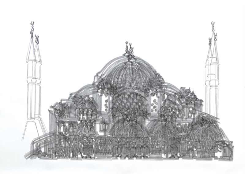 Spaces with Suitable Temperature gathers drawings from his series “Spaces of Memory” on which he has been working since 2014, and adds new works to the series. The historical buildings documented in the exhibition cover over 15 centuries, from the Kariye Mosque built in 536 to the Ataturk Cultural Center (AKM), completed in 1969. A number of large- and small-scale drawings show (and are titled after) specific pieces of architecture that are monumentalized structures crucial to the formation of Turkey’s history, such as the Ataturk’s mausoleum Anıtkabir (2014), the Dolmabahçe Palace (2014), Istanbul University (2014), and the Hagia Sophia (2020). Saray’s artworks do not depict these historical structures straightforwardly, in the way you might see on postcards. Instead, he takes well-known images of them and reconstructs them on paper, repeatedly drawn with slight changes in placement or point of view, resulting in an oscillating effect. The result is a blurred, vibrating representation with no perceptible borders or contours. Some drawings look glitchy, and fittingly so, as remembering is always imperfect. The ambiguous quality speaks to both the similarly hazy lines between history and memory, and the slippery nature of remembering and forgetting.